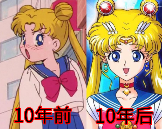 就拿《美少女战士》中的主角月野兔来举例。10年前的月野兔婴儿肥还没有褪去,整个角色形象圆圆的显得非常可爱,可能是当时动画制作的问题,原来的月野兔皮肤泛着一层粉色,而现在的月野兔就像是近视眼戴上了眼镜,整个角色看起来明朗了很多。