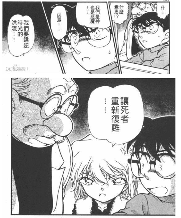 最重要的一点就是,APTX4869原本其实是一种逆转身体机能的药物,工藤新一服下的其实是半成品,所以造成了身体恢复为孩童的现象。而黑衣组织的成员贝尔摩德的名言:“We can be both of God and the Devil.Since we are trying to raise the dead against the stream of time.” (我们既是上帝也是恶魔。因为我们要逆转时间的洪流,让死人复生。),会不会就是指明组织的目的其实是复活乌丸莲耶呢?