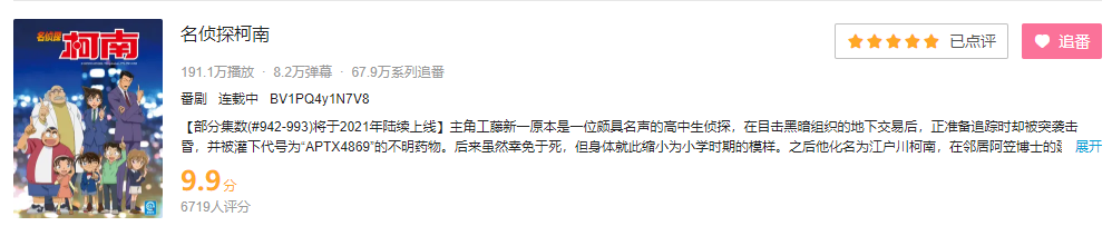 近日,B站买入了人气动漫《名侦探柯南》的动画版权,这也是《名侦探柯南》时隔8年之后再次登上B站(8年前因为版权问题下架了)。而在动画刚刚上架之后,众多B站用户就纷纷开始追番和打分,截至到小编发帖的时候,已经有将近7000人给《名侦探柯南》打分了,评分高达9.9