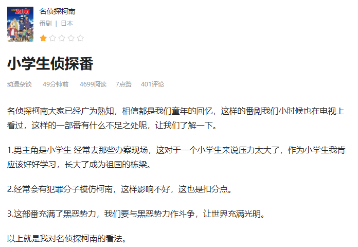小编翻阅了一下《名侦探柯南》的点评,虽然基本上都是五星好评,但是在长评中,小编还是发现了一条“与众不同”的评价。一位观众直接给《名侦探柯南》打了一星差评,理由有三条: