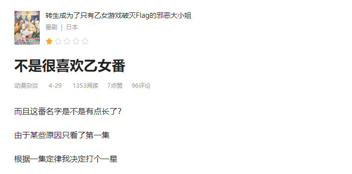 看完这位观众的评价,小编直接懵逼了,随后小编打开该用户对其他番剧的评价,结果非常令人震惊。原来不光《名侦探柯南》被他打了差评,像《异度侵入》《JOJO的奇妙冒险》《转生成为了只有乙女游戏破灭Flag的邪恶大小姐》《公主连接》等作品均被他打上了一星差评,理由也是非常奇葩。