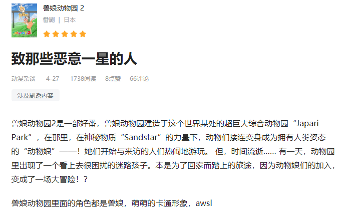 当然,该用户也不是所有的番剧都给一星差评,比如有一部番剧就被他打了五星好评,这部番剧就是《兽娘动物园2》。