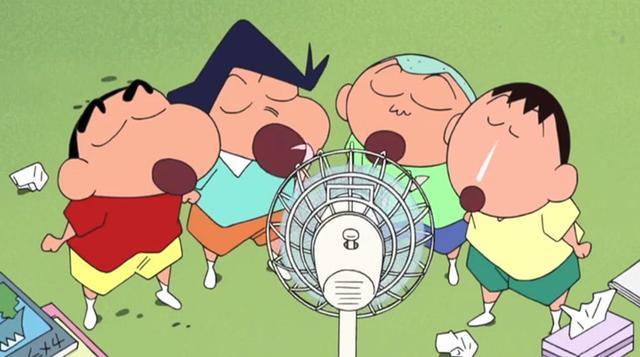 在《蜡笔小新》有一集中,小新、风间、正南和阿呆就轮流对着风扇唱歌,玩得不亦乐乎。