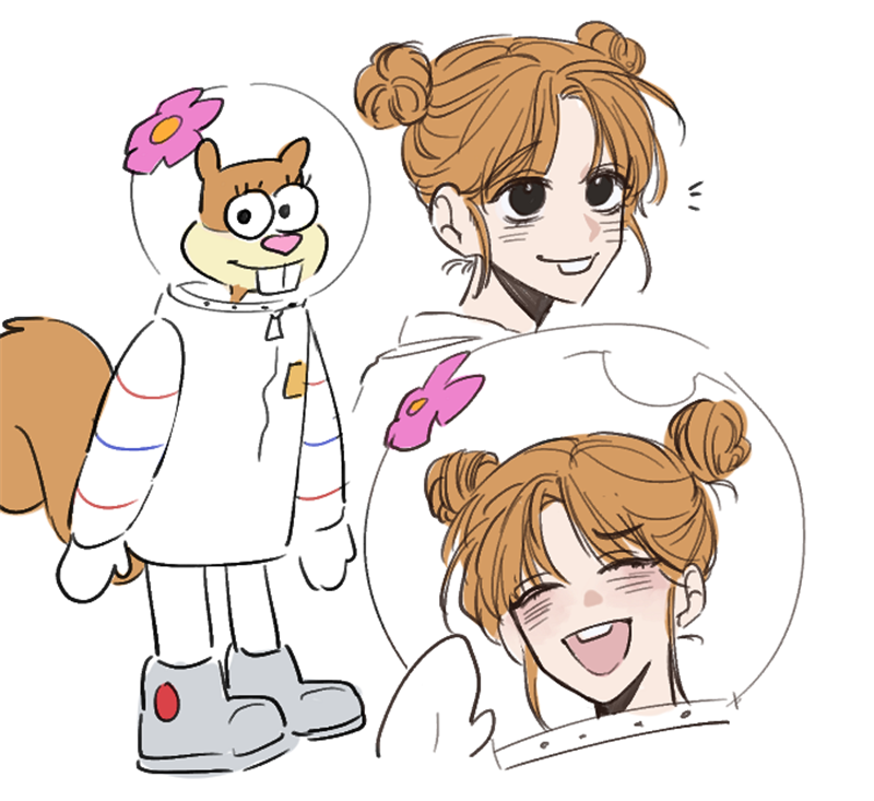 ▼作为《海绵宝宝》中少有的女性角色,珊迪和海绵宝宝也是好朋友,但由于她是一只松鼠,所以外出就要穿着白色航空服和戴着头盔,才能够自由呼吸,在她自己的家里就无所谓啦!拟人化后的珊迪,两只松鼠耳朵变成了两个小丸子头,牙齿还是一如既往的“突出”,这样的珊迪又甜又可!