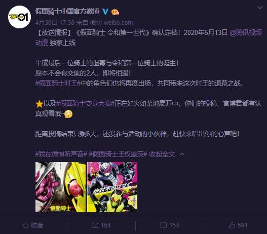 4月30日,假面骑士中国官方微博宣布:「假面骑士令和第一世代」确认定档!将于2020年5月13日腾讯视频动漫独家上线,以下为此次官方公开的细节内