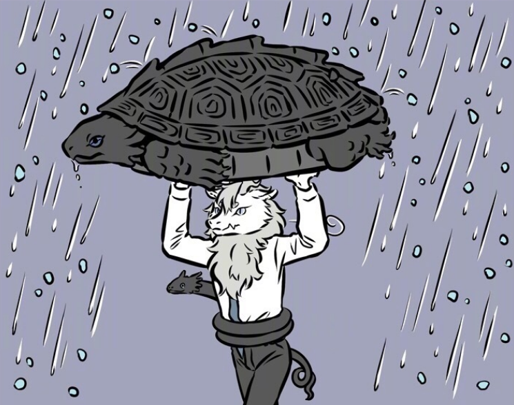 于是烈烈和玄武兄似乎心有灵犀,他们似乎想到了什么点子,彼此都冒出了小灯泡。不知道两人会想出什么点子来应对外面的冰雹。现在两人就像同是天涯沦落人一样。