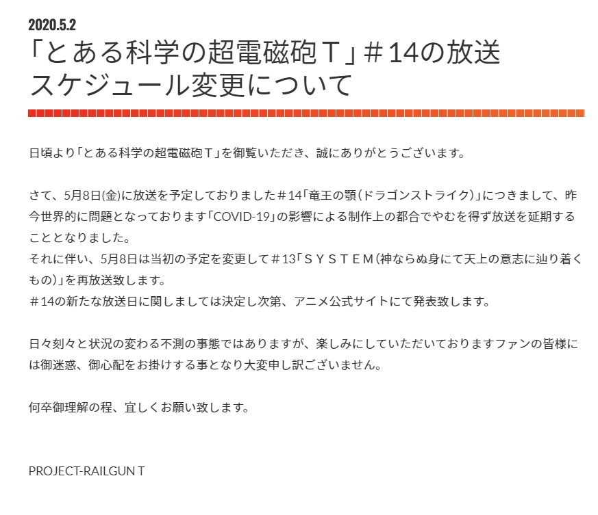长达半个月的等待后,观众们终于在御坂美琴生日这天,等到了动画《某科学的超电磁炮T》的复播,在大家纷纷祝炮姐生日快乐的欢乐气氛中,动画官方再次宣布停播,原定于5月9日播出的第14话将会延期,播出时间未定