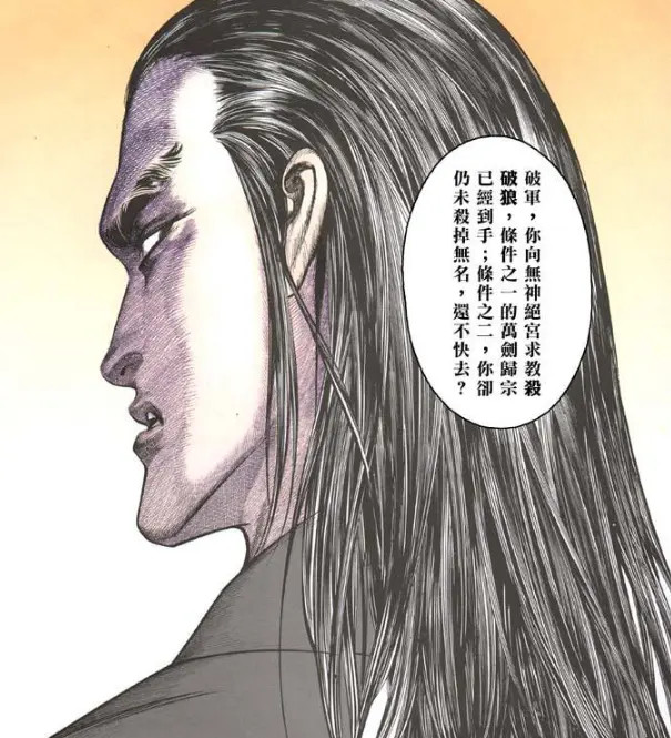 破军虽然为无名的师兄,其武功、天赋皆不如无名,为了完成击败无名的心愿,他不惜前往东瀛换取杀破狼,除了颜盈之外,破军换得杀破狼的条件其一是将万剑归宗献给无神绝宫,其二是当场手刃无名,替绝无神解决中原的这颗“绊脚石”。