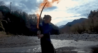 不过这一次,又有厉害的高玩挑战还原了19话登场的日之呼吸的日轮刀,在不使用电脑CG的前提下,制作出绚丽的特效般的效果,但这效果是出自真正燃烧的火焰;