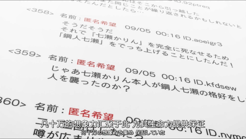 谎言最终成为了现实,这就是破案的最高境界吧,六花犯了一个致命的错误,那便是建立了这个钢人七濑的网站,为之被琴子所利用,将所有的信息都推向了原偶像的身上,所有的矛头都指向了七濑花凛,即便幕后不存在这个角色,可网民却坚信不疑,为其想象力亡灵就此不攻自破。
