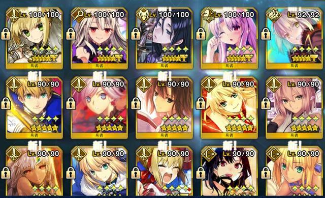 花嫁尼禄,虽然现在觉得这花嫁人设一点也不好看,但是很喜欢尼禄的我还是抽满了五星的花嫁尼禄,喂满了宝具,然后2位伊莉雅全部满宝310自然不用多说,四星尼禄给到90级,奶光就是属于那种,“多少任务都是靠她辛劳通关的,无论如何要喂满”的感恩;黑贞我只喂了一个圣杯,相当咸鱼了