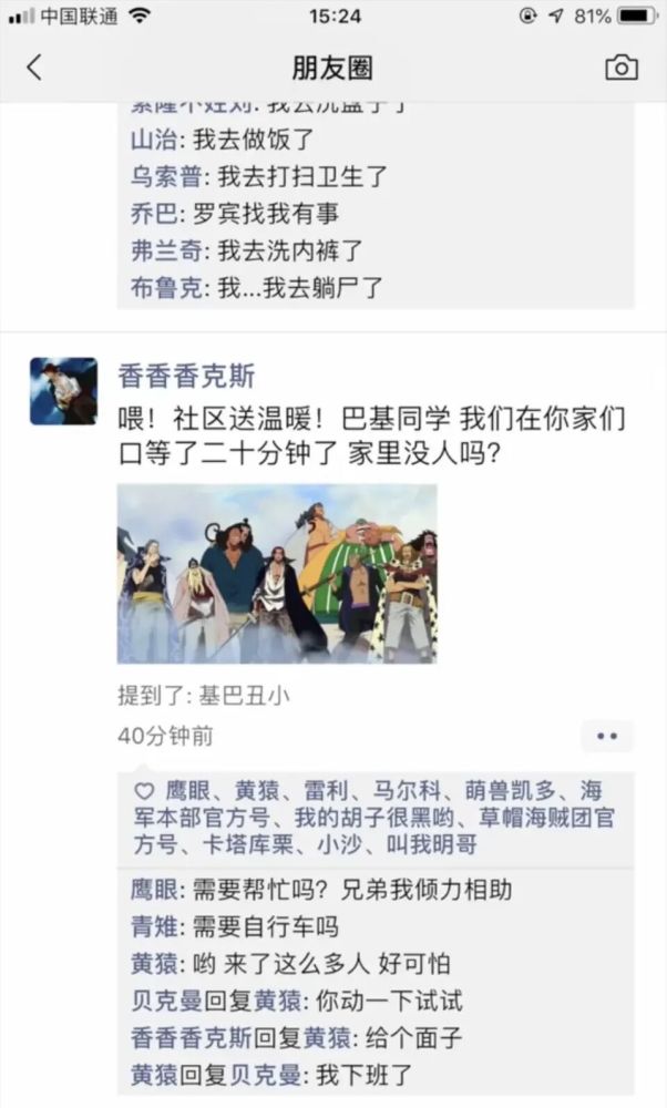 在这之后,香克斯就在朋友圈发了自己海贼团的合照,他们已经到了巴基楼下,一群人准备讨伐巴基了,而鹰眼作为红发的好朋友,也表示自己可以帮忙,黄猿就更搞笑,在这个时候还不许动。