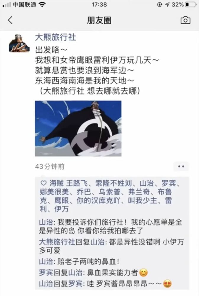 朋友圈中有很多发广告的,大熊就是这样的存在,大熊的果实能力非常适合开旅行社,所以他也是在朋友圈晒出了自己的广告,山治这个时候又发话了,凭什么把路飞拍到女儿岛,而把山治拍到人妖岛?