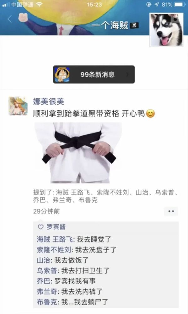 而娜美的朋友圈就十分暴力了,他晒出了自己拿到跆拳道黑带的照片,并且艾特了草帽海贼团,草帽海贼团本来就被娜美欺负惯了,所以赶紧溜了,可是为什么弗兰奇要抢布鲁克的内裤呢?