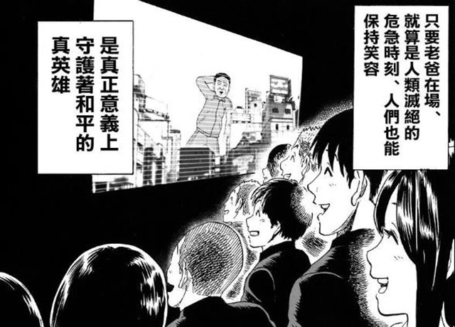 将两部作品放在一起,你会发现故事中出现三种截然不同的英雄定义:埼玉和大石都拥有能够打败怪人的超强实力,但是对城市做成极大的破坏;大石父亲,实力不强,但是却能够保护城市完整性,人们笑着看他战斗,大石让群众的心安稳。大石的父亲希望自己的儿子,拥有强大力量的同时,能够让群众笑着看他战斗。