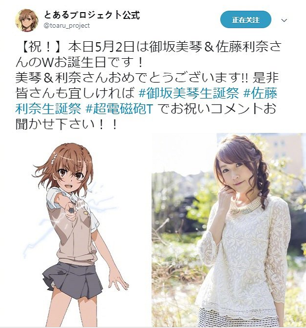 另外值得一提的是,为炮姐配音的声优佐藤利奈同样也是在5月2日生日,不但为炮姐配音,而且还跟炮姐同一天生日,JPGJPG,这可以说双喜临门了。