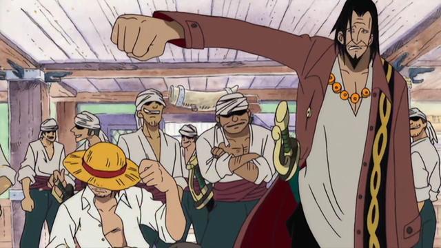 而后因为山贼王得罪路飞,红发迫不得已与山贼王发生了战斗,因为他最讨厌的就是欺负自己同伴的人,与山贼王一事解决后,红发将自己最珍惜的草帽送给了路飞,自己则带着自己的海贼团离去,当时红发离去的时候也给到了他海贼团一些镜头,早期他的海贼旗的骷髅头是笑着的,暗示红发本人是非常积极向上,并且开心的。