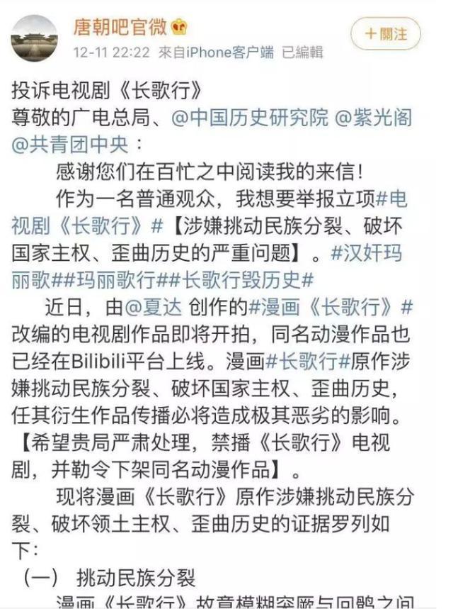 某位“唐粉”亲自写了41页的举报信将《长歌行》电视剧告上广电总局,一时间关于《长歌行》是否篡改历史的讨论在微博、贴吧和知乎上都闹得沸沸扬扬,争端也从是否停止《长歌行》电视剧的制作,变成了《长歌行》漫画应不应该封禁。
