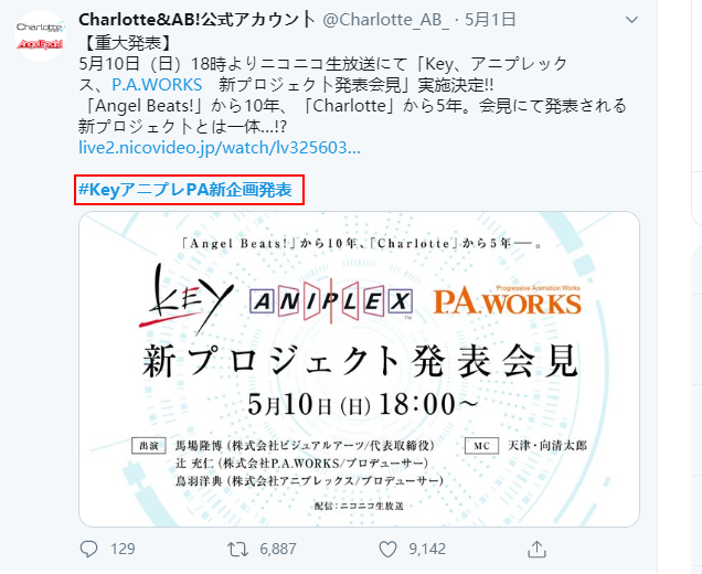 在2020年4月1日,也就是愚人节当天,《AngelBeats》和《Charlotte》的动画官方发推文称“有新动作”。虽然大部分的粉丝表示很高兴,但由于这条推文是在愚人节当天发布的,所以也有部分粉丝认为这是一个“愚人节玩笑”。不过,随着官方推文的再次更新,这个“愚人节笑话”的说法也成为了历史了。没错,就如同动画官方在4月1日的推文中所宣布的那样,“新作发表会”将在2020年5月10日于niconico发