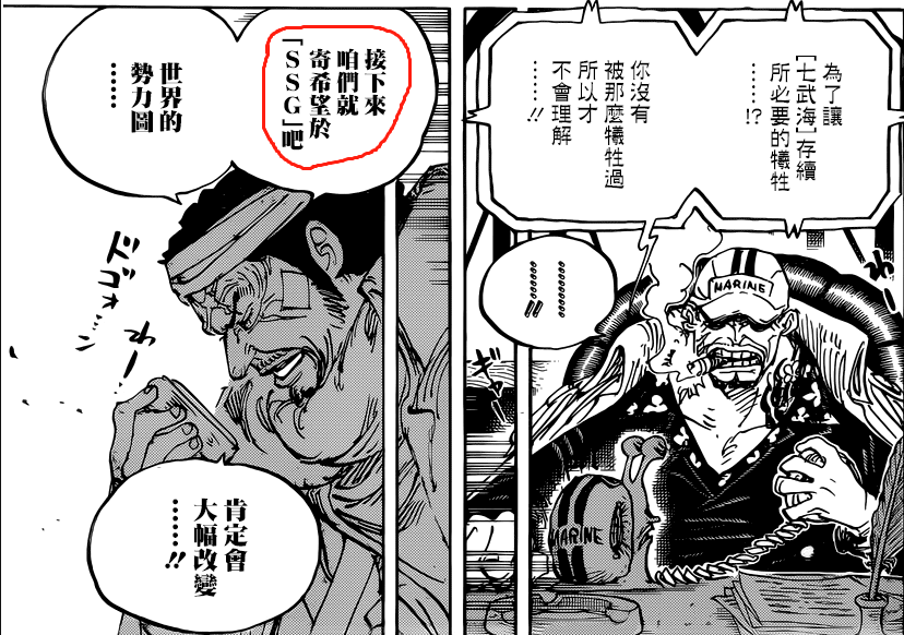 而这个替代品就是,在七武海被废除后,藤虎在与赤犬通话时,提到的“SSG”了,虽然到目前为止的剧情中,还没有具体的解释,世界政府的这个可以替代七武海的“SSG”究竟是什么。