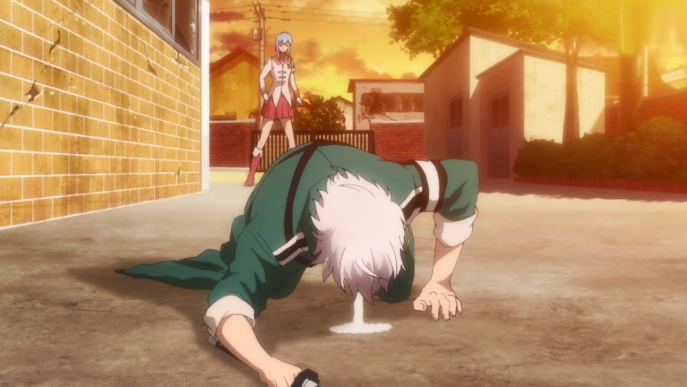 杀害敌人后,离人在大家面前装出了往常的那副嬉皮笑脸的模样,可他的内心实际上是倍感煎熬的。为了不暴露自己,离人故意逃走,其他人都以为离人没事,但阳菜却发现了。阳菜追赶着离人的脚步而去,也找到了躲在教学楼旁的痛苦的离人。