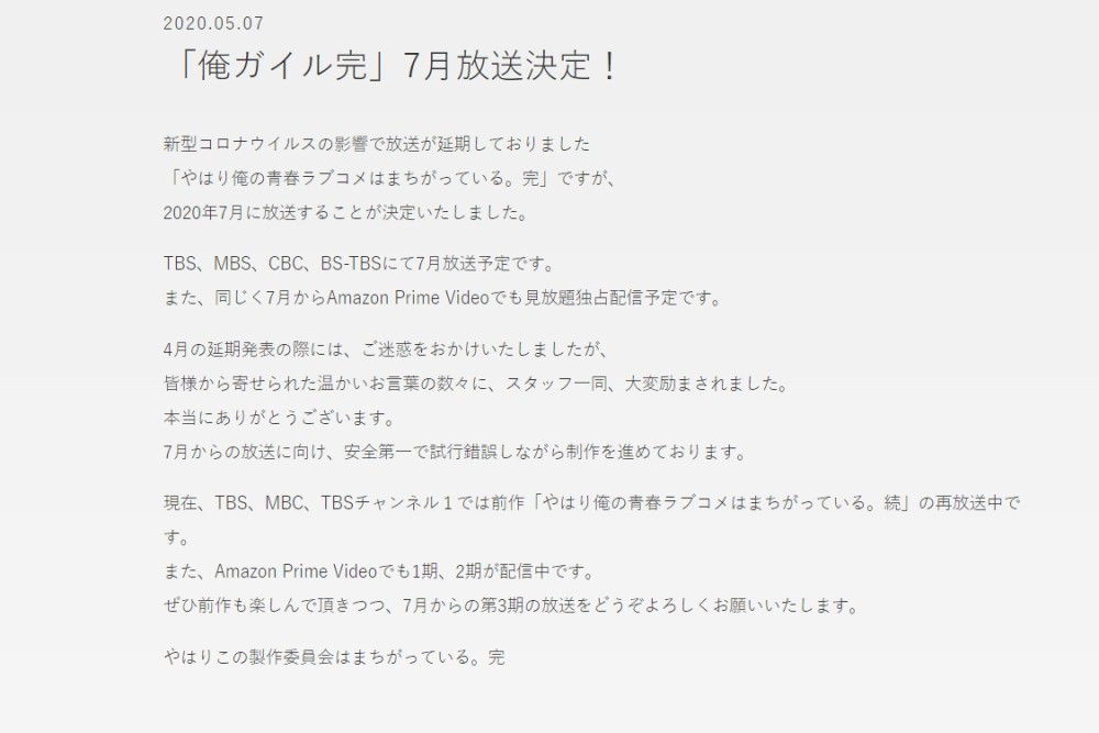 为什么说《我的青春恋爱物语果然有问题》第三季是再次定档呢?原因相信很多追番的小伙伴,也都清楚。本来,第三季是和众多作品一样,决定2020年,4月上映的。可就像原定于四月开播的很多动漫一样,因为疫情的影响,开始宣布延期。