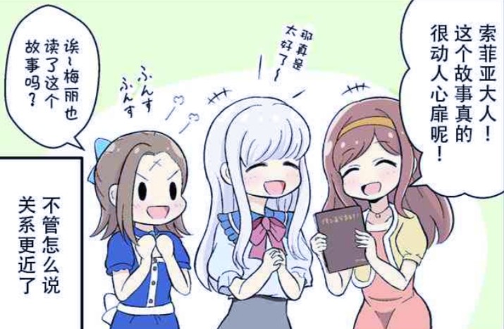 在卡塔莉娜和索菲亚一起讨论恋爱小说时,玛丽只能在一旁醋意满满的看着,不能够跟喜欢卡塔莉娜互动,实在不甘心,实在不想被晾在一边。