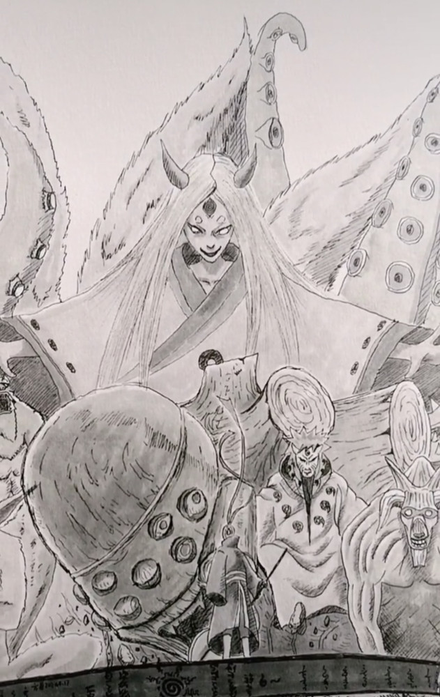 护额中间站着宇智波带土,仔细一看,辉夜和六道仙人画得有点丑,和原画有些差距。
