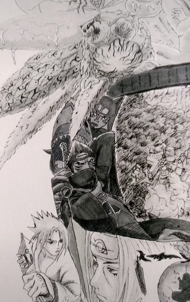 护额画的木叶村,这是原始木叶村最后的容貌,天道佩恩用神罗天征摧毁后,重建的木叶已经不是这个样子了。