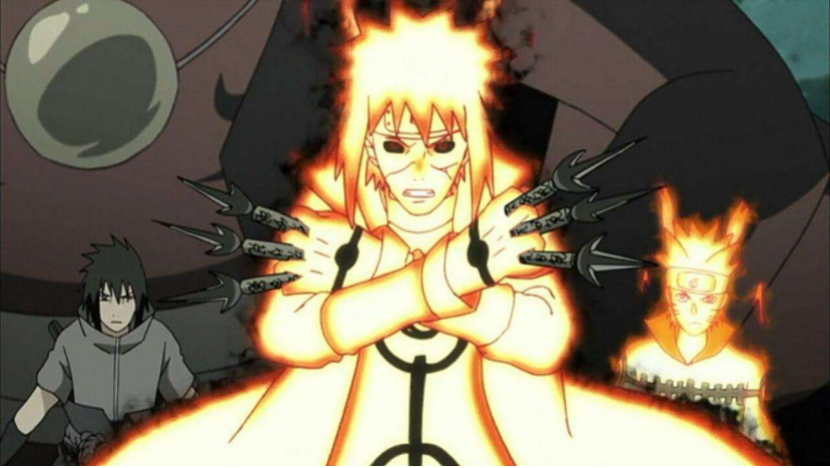 这一经典一幕发生在第四次忍者大战中,本来以保护八尾和九尾为初衷的战役,因敌人过于强大,演变成以尾兽及主角为中心的决斗,但斑爷与带土召唤出十尾后,战局还是急转直下,直到佐助带着先代火影到达战场,当然主角之父也在其中,正所谓上阵父子兵,一时给他爷俩嘚瑟的。