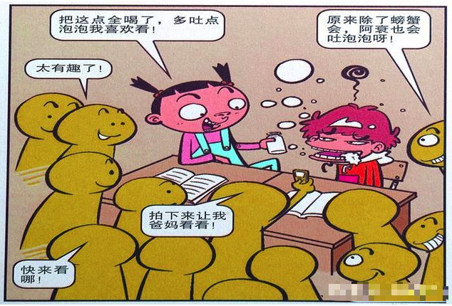 吐泡泡的螃蟹想必大家一定都见过,但是吐泡泡的人可就很少见了,大脸妹被阿衰的滑稽行为给逗乐了,她慷慨地让阿衰把洗面奶全都喝掉,这样他们就可以欣赏到“阿衰吐泡泡”的奇景了。大脸妹此时的态度很是大方,可捉弄同学始终是不对的,大家还是得饶人处且饶人比较好。