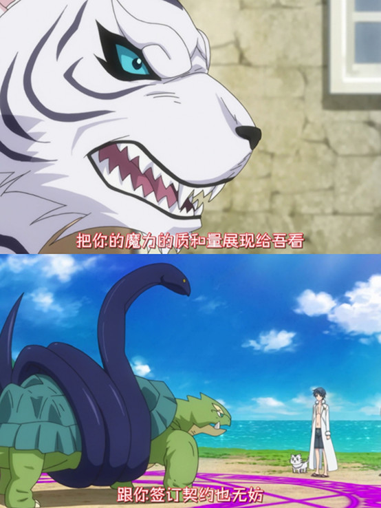 之后的故事中看到国王女儿公主召唤哈士奇以及冒险中看见魔法师召唤蜥蜴人,主人公也尝试进行了召唤,第一次就召唤到了最高级别的神兽白帝(老虎),并轻而易举的签下了契约,后来因为探索未知遗迹又和同为最高级别的神兽玄帝(海龟+蛇)签订了契约。