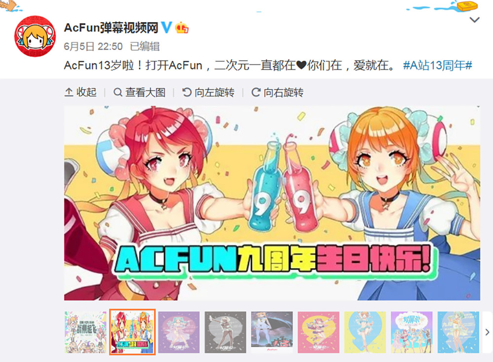 说起二次元视频网站,除了B站之外,A站也是被粉丝们广为熟知的一个网站。但是A站的实力已经远远不如B站。在B站的“饭圈事件”发生时,A站就打出了“欢迎ACer回家”的标语,而在6月5日B站下线2233娘当天,A站再次更新官微,向二次元粉丝们抛出橄榄枝,表示“二次元一直都在”,并且引用了大量AC娘的图片,和B站形成了鲜明的对比。
