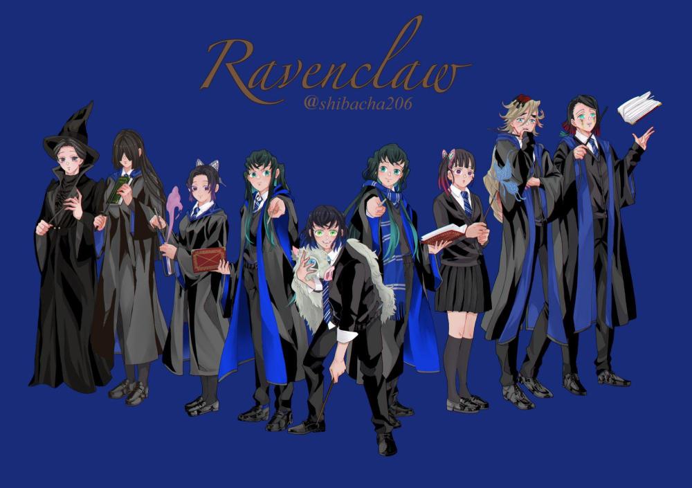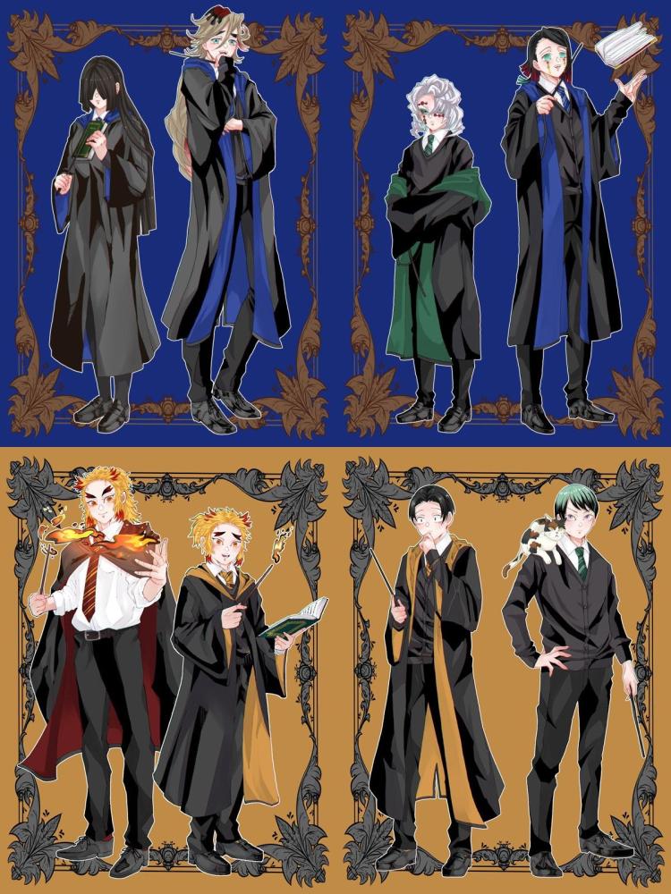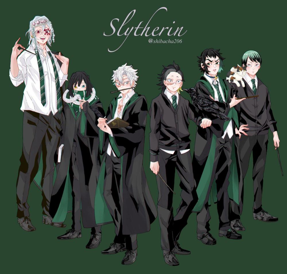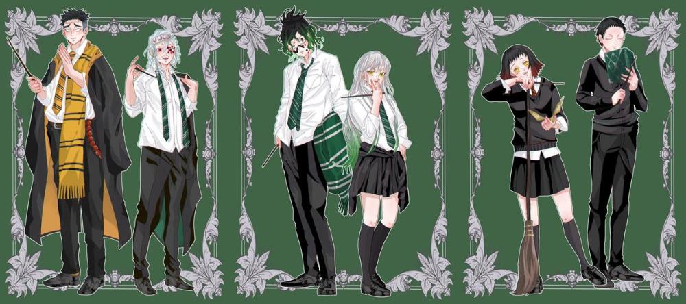 ▼《哈利波特》中第四个学院也登场啦!它就是绿色系的斯莱特林学院,也被粉丝们称为蛇院。有没有发现在这个学院的《鬼灭》成员们,居然没有一个女生,不过伊黒 小芭内注定是在这个学院的,毕竟是“蛇院”嘛!