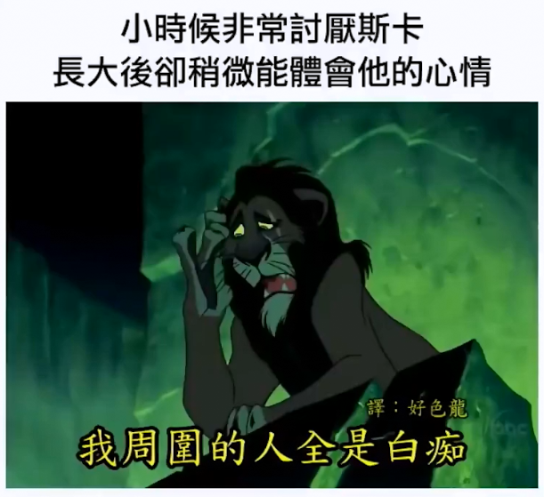 小时候看《狮子王》总是觉得“刀疤”就是一个大反派,直到长大后的今天才明白,小时候刀疤在动画中的表现是什么意思。从它的角度来看周围发生的事还有那些动物的所作所为都让人很无语,而这个表情包就是借着刀疤之口而做出的吐槽,在现实生活中使用率非常高。