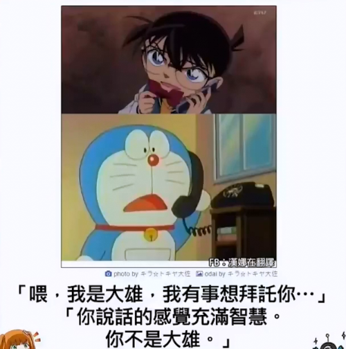 这个梗取自于《名侦探柯南》和《哆啦A梦》两个角色的对话。当你觉得你的朋友一反常态,平常热爱犯蠢的他不再犯蠢,使用以上的这个表情包就非常合适了。网友将小叮当和柯南的对话拼接在一起,毫无违和感。