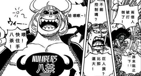 在981话中,路飞,索隆和基德等人因为和阿普的冲突而暴露了身份,随后凯多旗下的“蛮霸者8号”八茶也加入了战斗(蛮霸者是凯多的一群手下,体型都很巨大)。根据基德的描述,这位八茶的体型比巨人族还庞大。