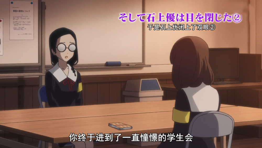 动画第9话虽作为过渡回,但依旧有着很多有趣的展开,同时它还借助一些细节暗示了石上优的过去遭遇,以及之后的精彩表现。第9话一开始故事的小标题十分奇妙,明明说的都是伊井野弥子的种种幻想,而且石上优也并未在这幕故事中露脸,只是存在于弥子的只言片语当中,可却有着“于是石上优闭上了双眼”这样的标题,之后可能还会有。