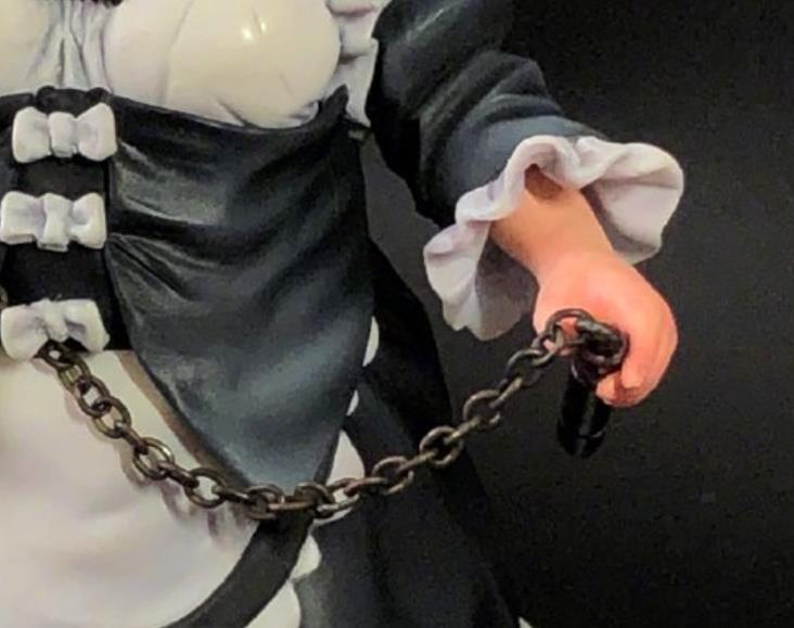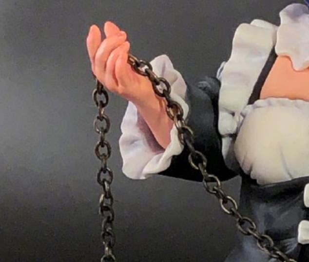 手办中的左手很精致,右手同样如此。这一刻蕾姆的右手握着粗大的铁链,显得她的手十分粗壮。手指的制作很还原,很像是真人的皮肤。如果只看蕾姆的一双手,我会觉得这就是一个真人的手,而不是来自一款手办。足以说明这款手办的制作有多么贴近真人。