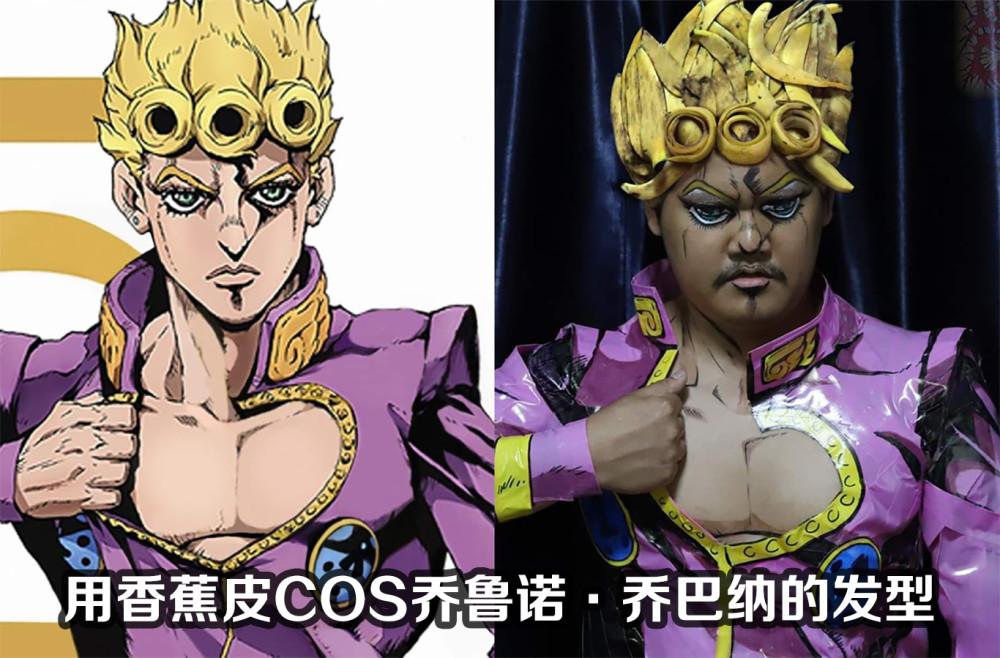 再比如说用香蕉皮成功COS出了乔鲁诺乔巴纳,看起来找不到任何槽点。泰国小哥总能以各种各样的创意还原二次元中的角色。