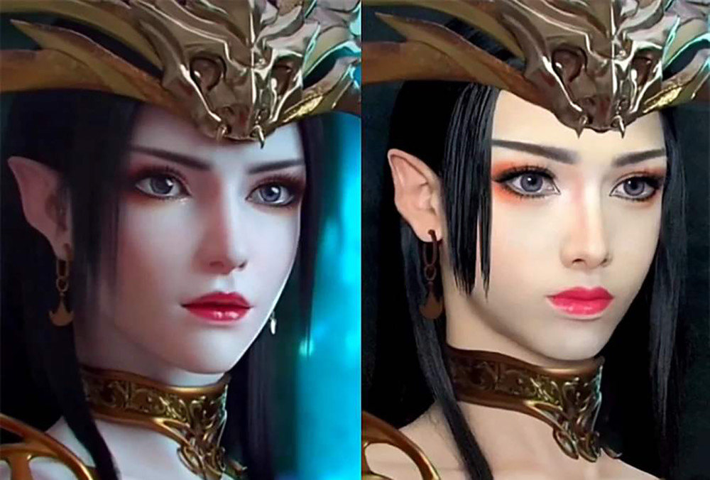 看完欧美的COS风格之后,再来看看国内的COS。中国的COS文化起步比国外晚很多,但是国内也发展出了一套属于自己风格的COS,那就是仿妆。国内很多COSer的仿妆技术都非常高超,我们经常可以在网上看到一些仿妆作品,和动漫中的角色相比甚至可以以假乱真。比如说有位粉丝就凭借着超高的化妆技术还原了《斗破苍穹》中的美杜莎女王。