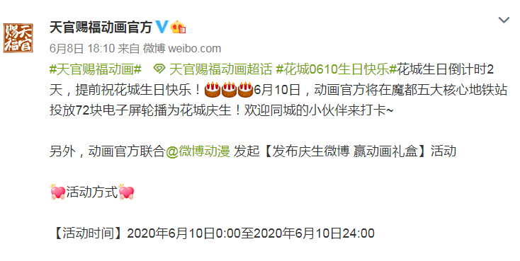 《天官赐福》漫画官方发出了参与活动免费送周边的邀请,而动画官方更是一掷千金,直接在魔都的五个地铁站,72块电子屏,轮番为花城庆生。不得不说,羡慕在上海的小伙伴,你们真是太幸福了。