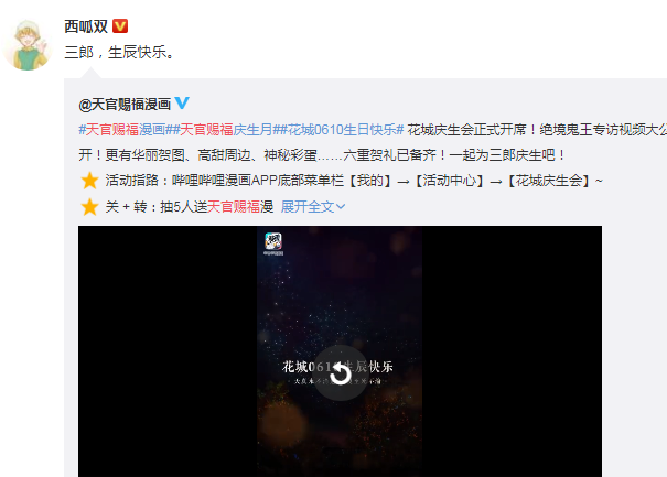 有了漫画的好底子,对于《天官赐福》的动画相信粉丝们更加期待。而今年是《天官赐福》的动画和漫画官方第一次为男主花城庆生,双方都放出了大量的粉丝福利。
