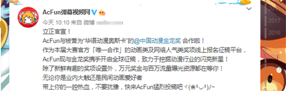 AcFun的官博发表了这么一条消息,AcFun与被誉为“华语动漫奥斯卡”的中国动漫金龙奖合作啦!作为本届大赛官方「唯一合作」的动画类及网络人气类奖项线上报名征稿平台, AcFun现与金龙奖携手开启全球征稿,致力于挖掘动漫行业的闪亮新星!除了新鲜有趣的奖项设置外,万元奖金与百万流量曝光资源都在等你!