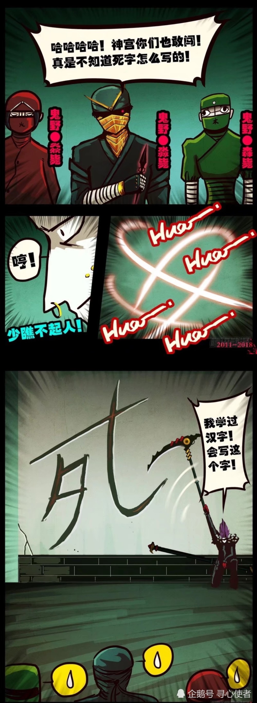 东瀛的天级高手鬼野淼毙嘲讽他不知道死字怎么写,居然敢闯入神宫。啄木鸟也不甘示弱,用玛雅神器在墙上写了一个死字。这一段是完美重现了一个网络老梗,“死字怎么写?”