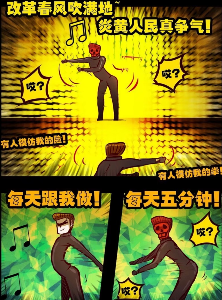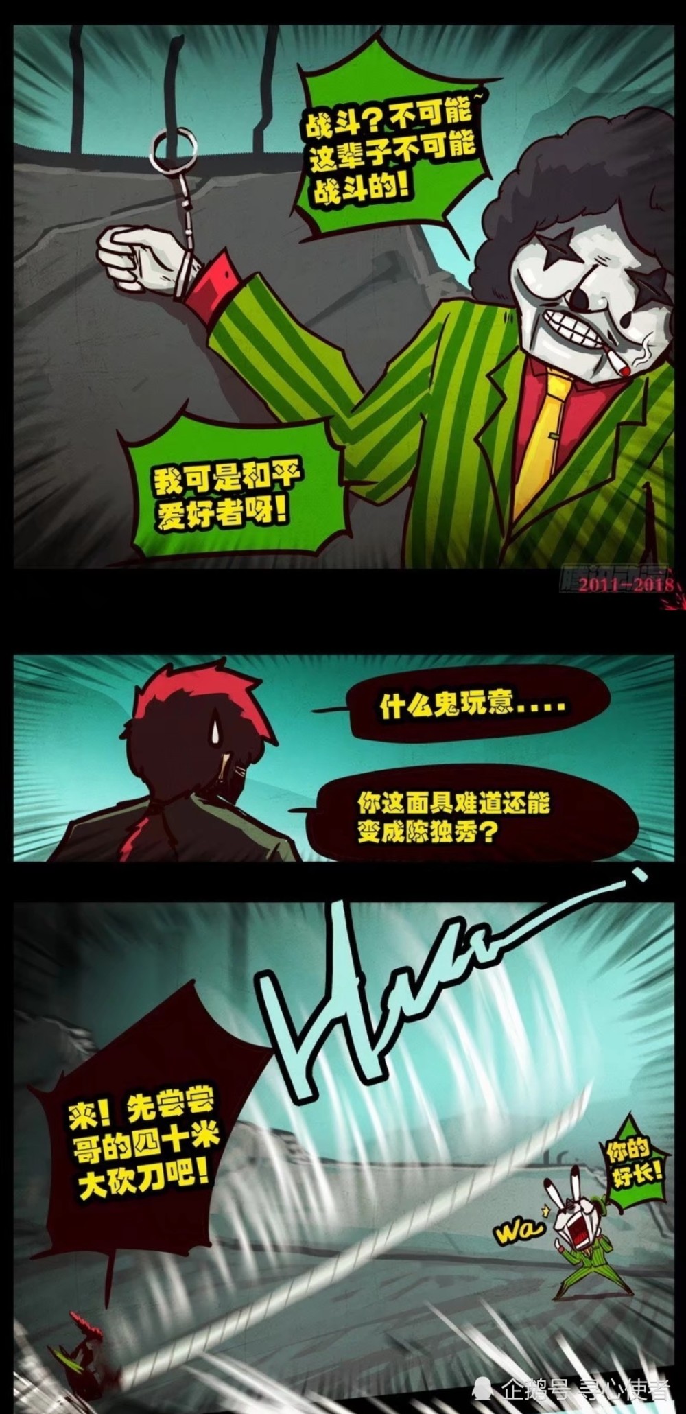 这一张图片,短短三格就玩了三个梗。前阵子刚刚出狱的电瓶杀手,尽量坐着说话的陈独秀,先让人跑39米的大砍刀。这些都是大家好熟能详的故事点,鱼叔将它们融入到了一起,让原本紧张的战斗气氛变得有些奇怪了.....