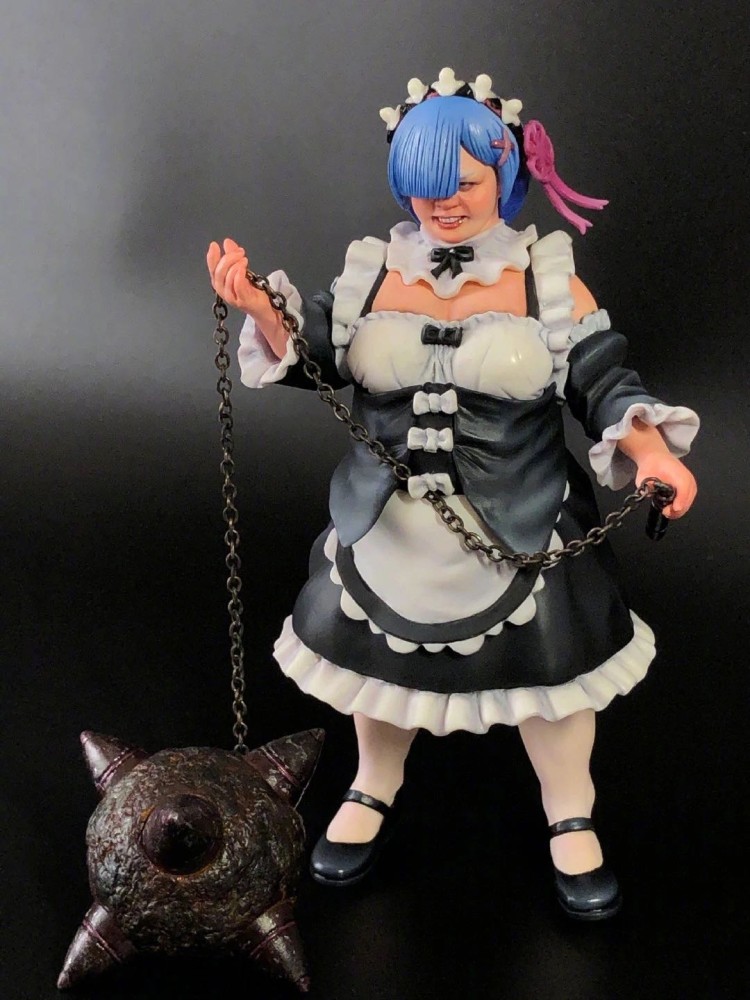 我们平时看到的蕾姆手办一般多为花嫁、泳装、女仆装,上次的“邪恶笑”蕾姆已经可以说是到了怪异的极限了。而这一次这位日本大神可谓是再一次地刷新了我们的认知,亦或是说毁灭了我们美好的幻想。大家看看这款“发福”后的蕾姆手办,是不是一瞬间就能让你觉得自己看到了一个假蕾姆,这绝不是自己的女神?