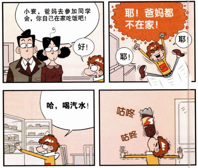 因为阿衰的爸妈这天准备要去参加同学会,所以会不在家一整天,所以阿衰的爸妈就跟阿衰说了,让阿衰好好的自己在家吃饭,在阿衰一听自己的爸妈要出门的时候,不知道有多么的开心,想着这次终于可以没有人管了,然后在等阿衰的爸妈出门之后,阿衰立马开冰箱喝汽水,不知道有多爽。