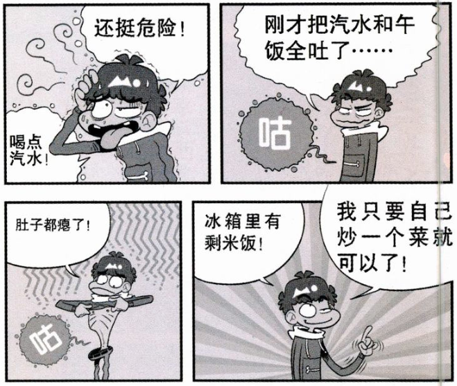 看来阿衰现在是知道喝汽水,一下子喝太多的话,真的也是很危险的呀,因为喝太多,搞得阿衰把自己喝进去的和吃进去的都给吐出来了,现在阿衰又感觉自己饿了,然后翻了冰箱一看,也就只有剩米饭了,阿衰要想着自己在炒一个菜就搞定啦!爸妈参加同学会,阿衰吃饭全靠自己,不是太饱就是太饿,现在就只能先想办法了。