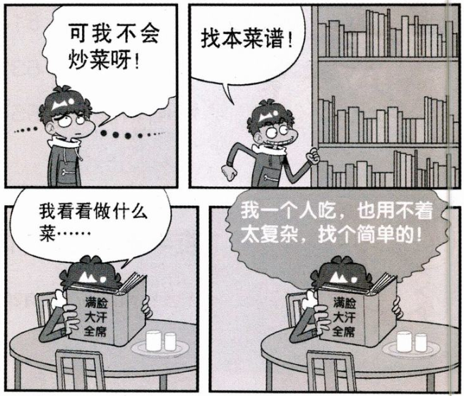 可是阿衰根本就不会炒菜呀,现在怎么办?突然阿衰想到了可以按照菜谱炒就好啦,然后就去找了菜谱来,可是阿衰看来看去,总是看不到满意的,自己一个人吃,也用不着炒那么复杂的,就找个简单的就好了,可是阿衰就连简单的都不会呀。真的好尴尬,看来只能饿肚子了。(图/猫小乐)